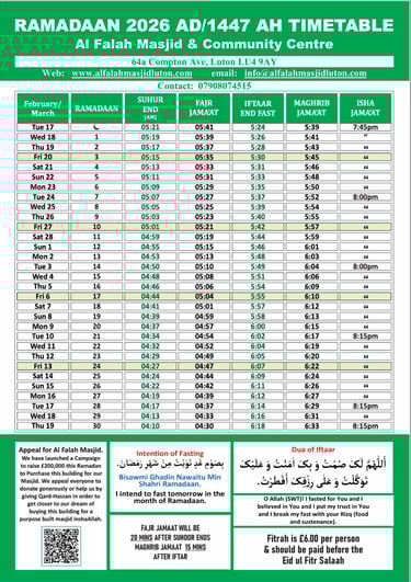 RAMADAN 2026 TIMETABLE
